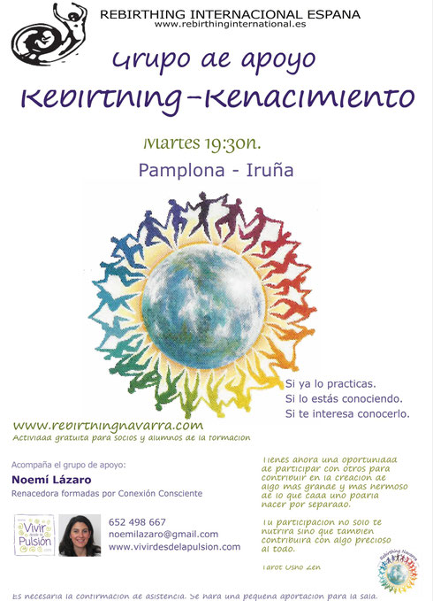 En colaboración con Rebirthing Internacional España, ofrecemos un grupo semanal de apoyo de Rebirthing en Pamplona. Nuestra intención es crear un espacio de encuentro en torno a la práctica del Rebirthing para personas que ya lo practican, que lo están conociendo a través de sesiones individuales o de la formación o que están interesadas en conocerlo.